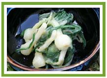 | 1.鍋に湯を沸かし、きれいに洗ったのびるの葉の部分を先に入れ、鮮やかな緑になったところで球形の部分も入れて、さっと茹で、取り出して冷ましておきます。 2.鍋に白味噌、砂糖、少量の水を混ぜ合わせ、弱火で、木べらで焦がさないように練って下さい。 3.つやよく、なめらかになってきたら火を止め、練辛子と酢を加え、よく練り合わせて下さい。 4.冷ましておいたのびると3を合わせ器に盛り付けたら完成です。 |